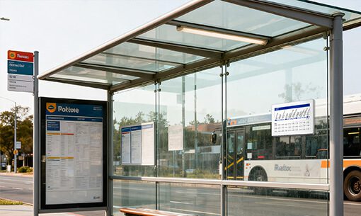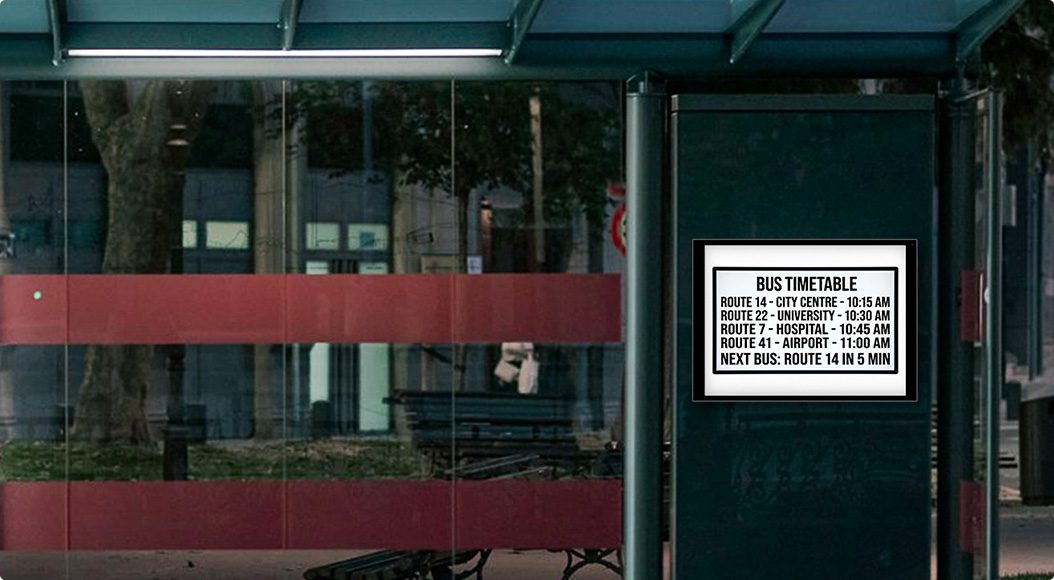 Bus stop timetables, parking guidance, and city wayfinding offer real-time, energy-efficient updates.